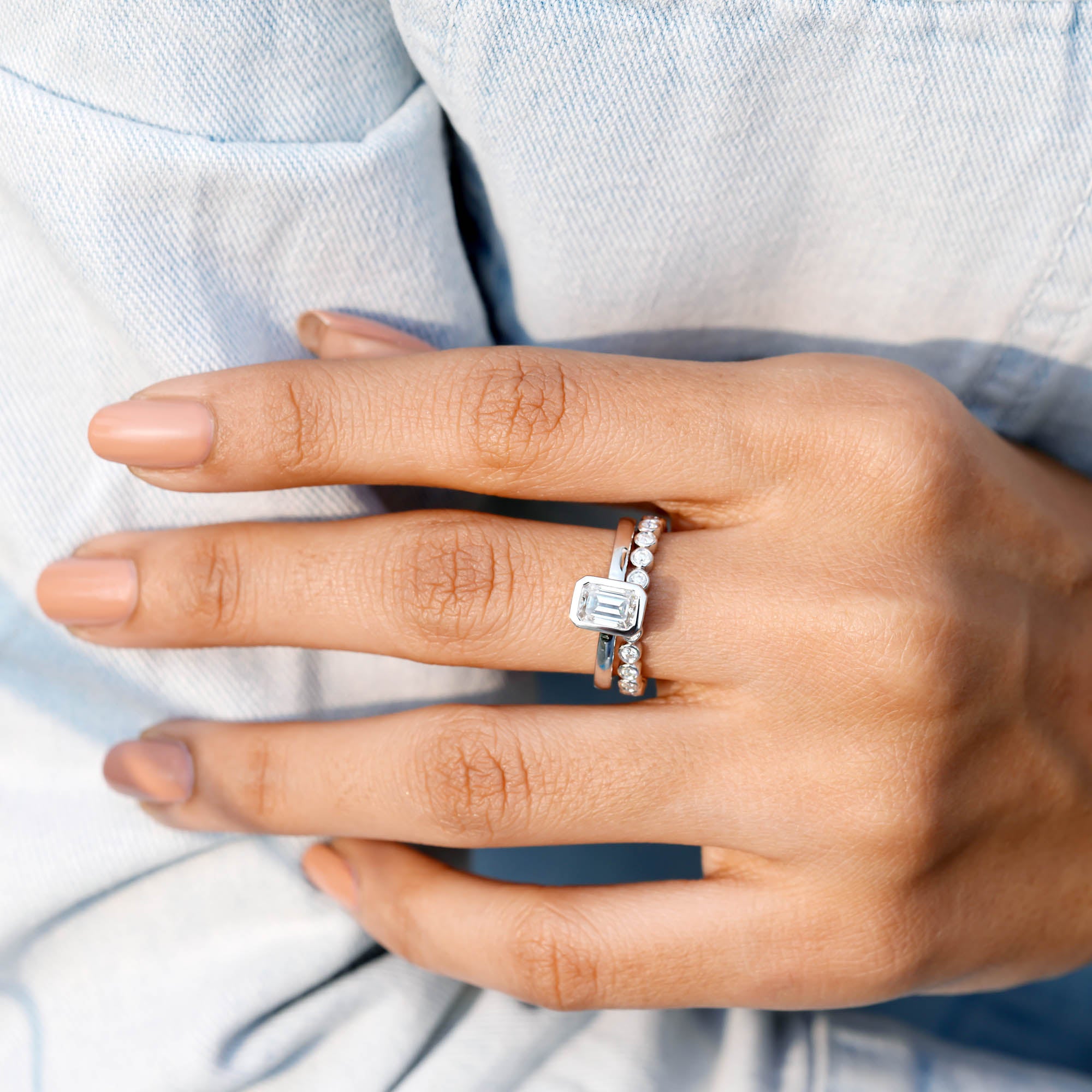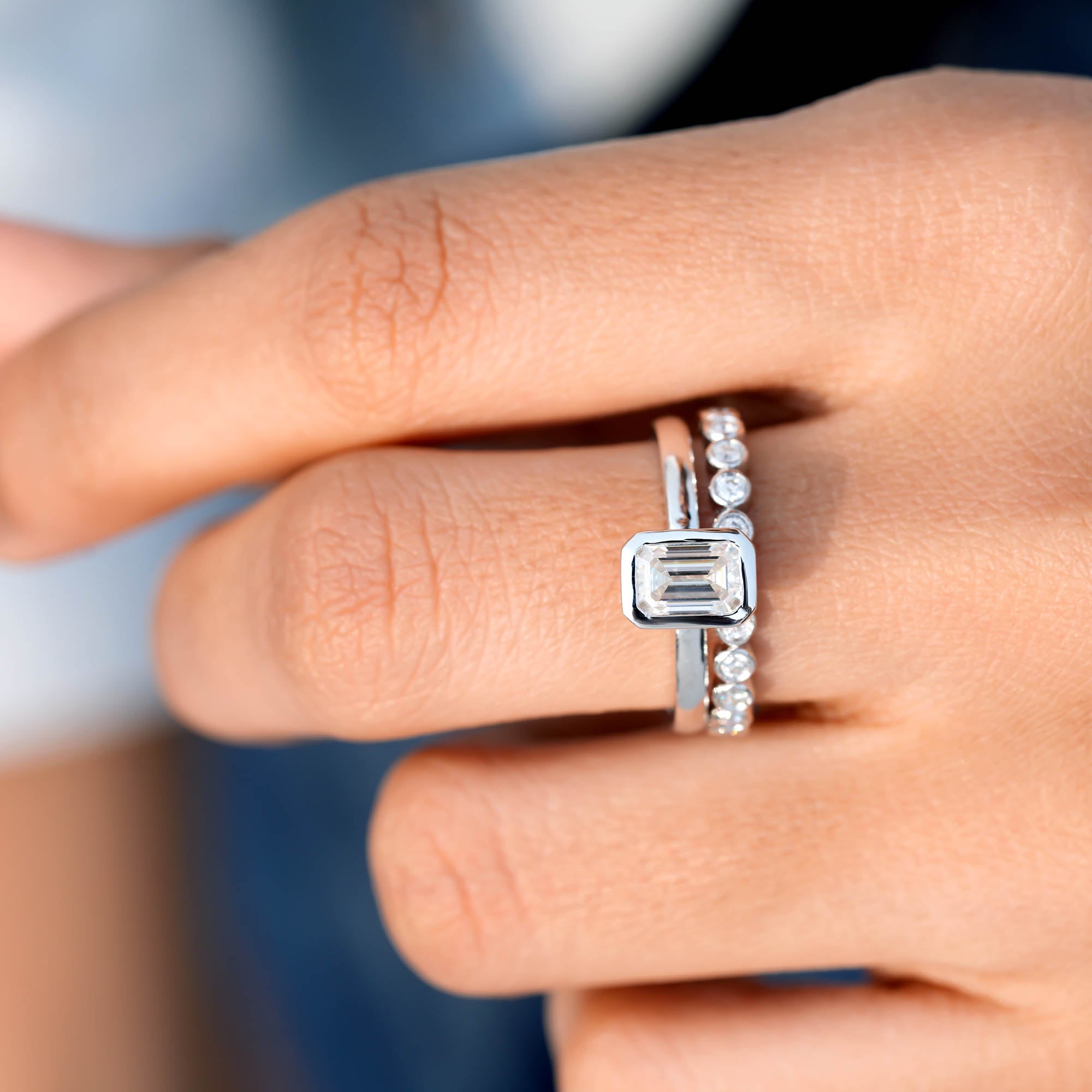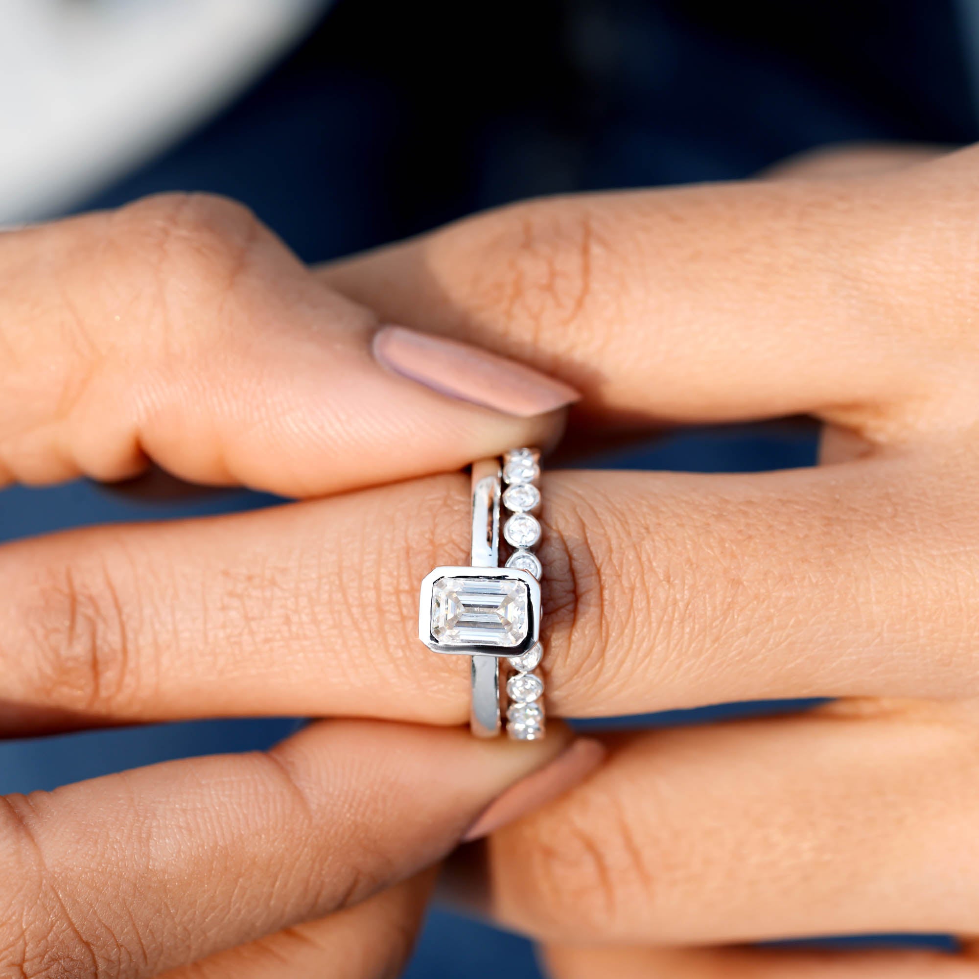 This 2.1 CT Emerald, Round Cut Colorless Engagement Ring showcases exquisite design and expert craftsmanship. The stunning emerald cut diamond paired with a round cut diamond band creates a timeless and elegant look. Perfect for those seeking a classic and sophisticated engagement ring.