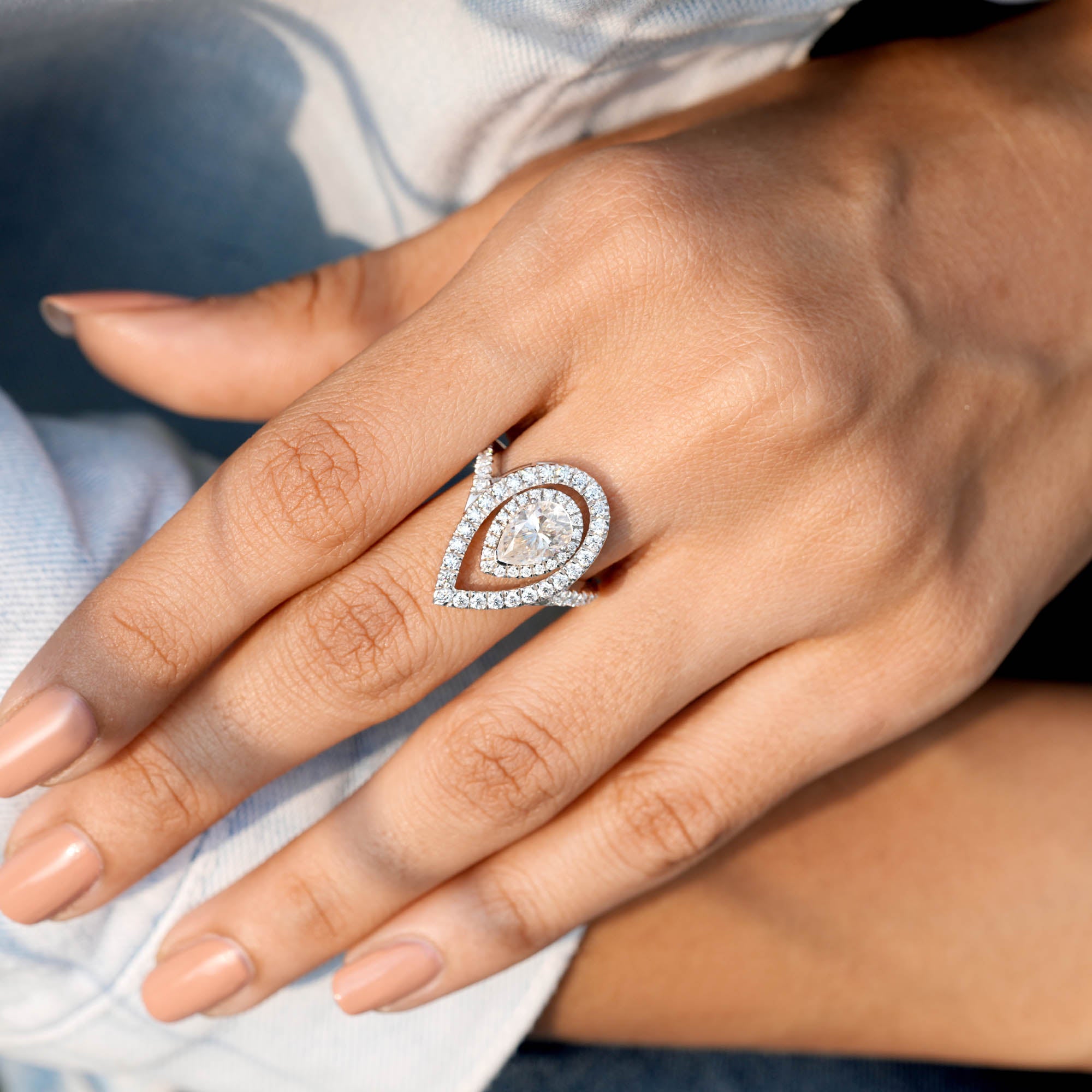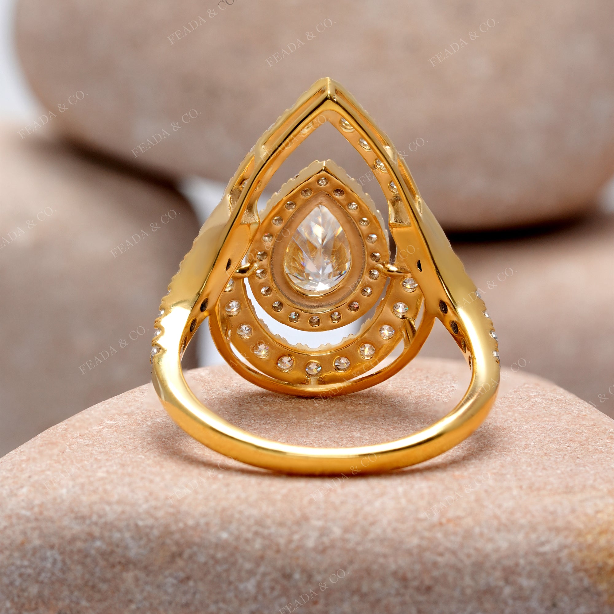 This 2.25 carat engagement ring showcases a stunning pear cut center diamond, surrounded by radiant round cut diamonds. The colorless stones offer maximum brilliance and fire, making this ring a timeless symbol of love and commitment.