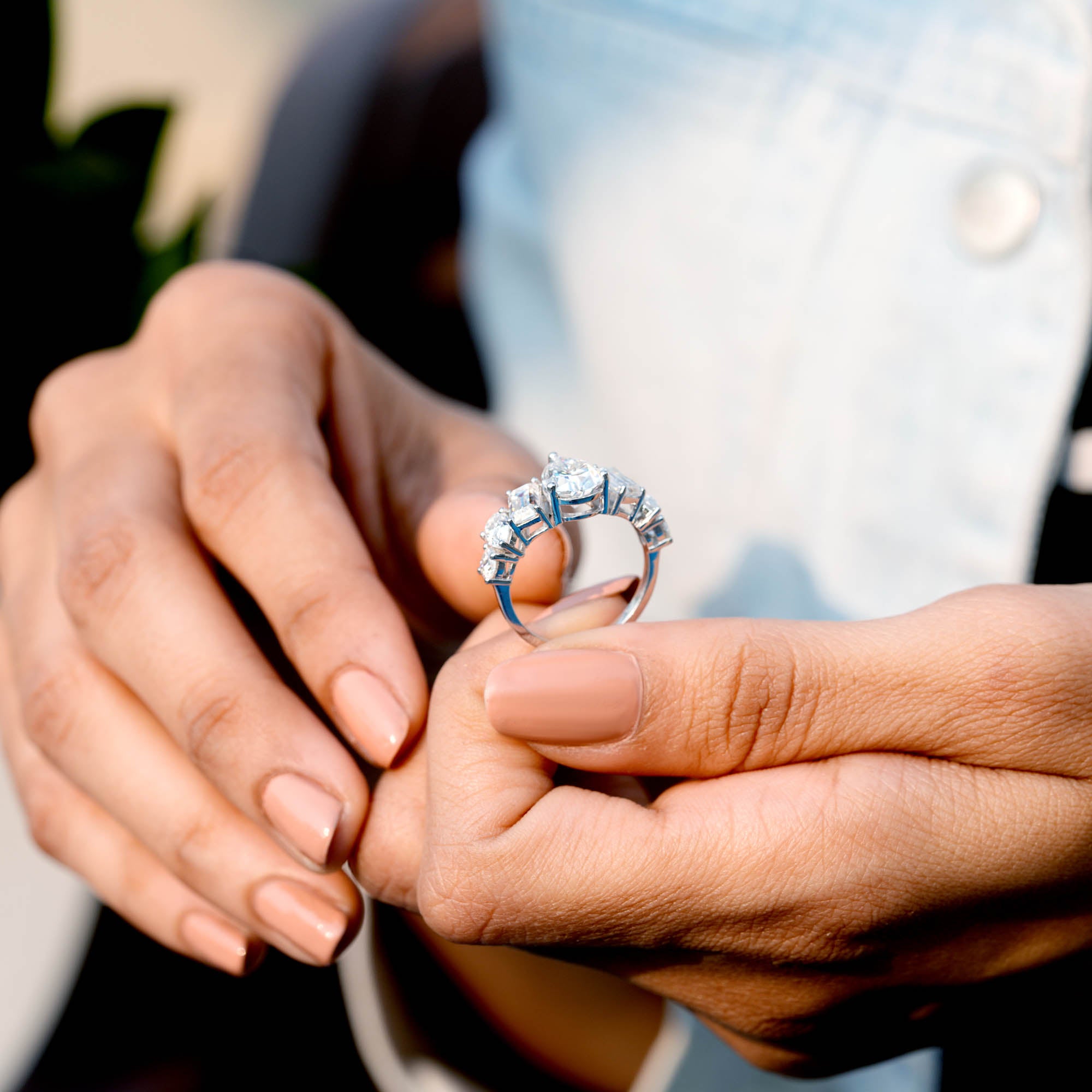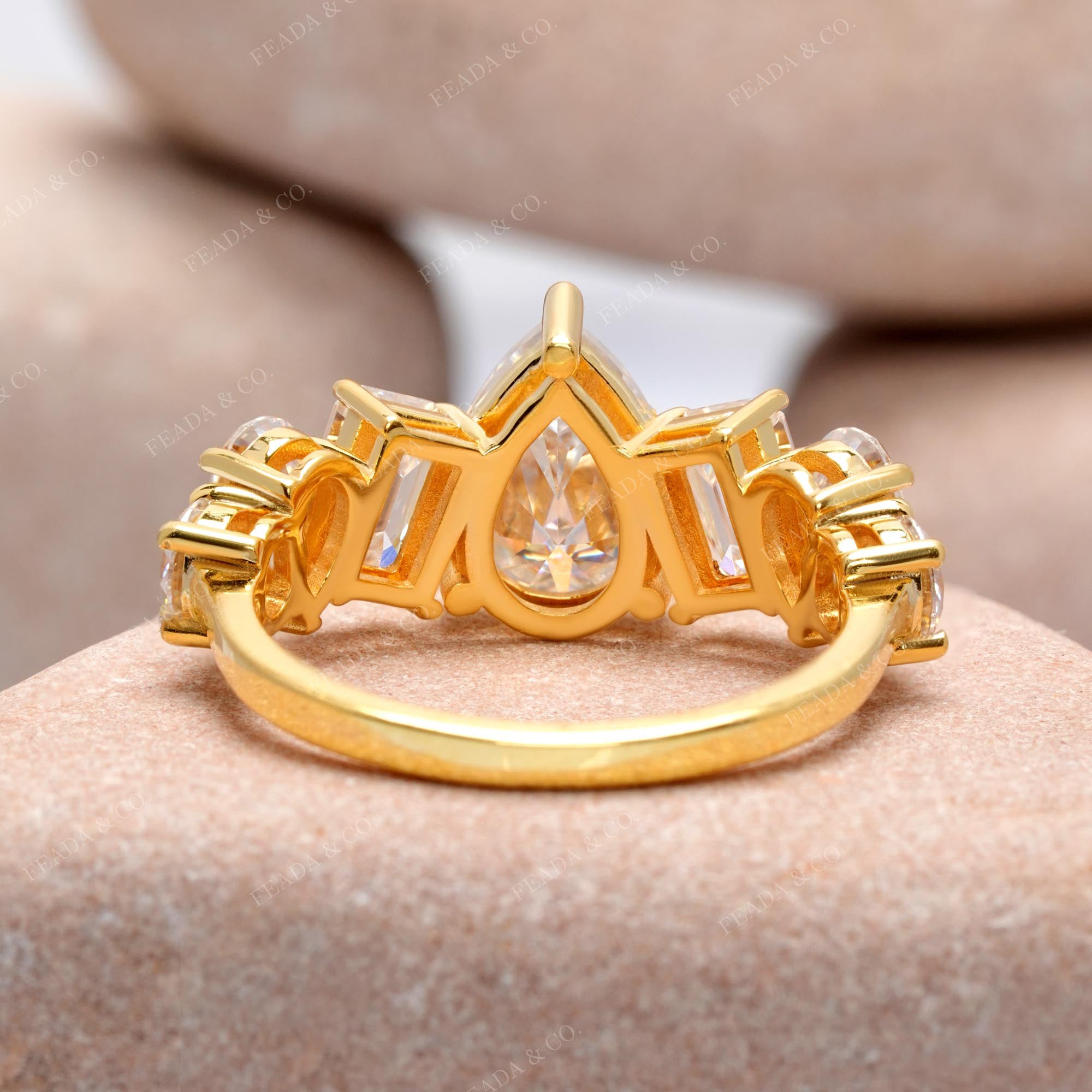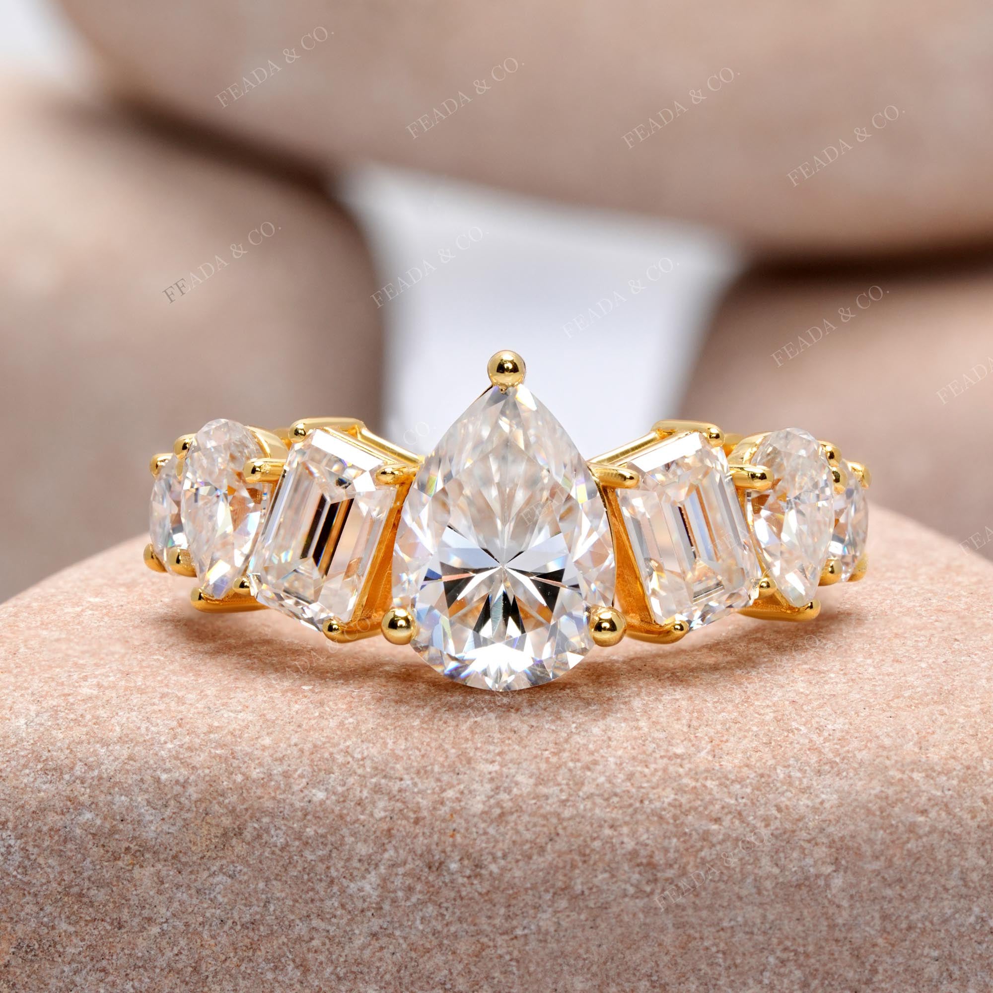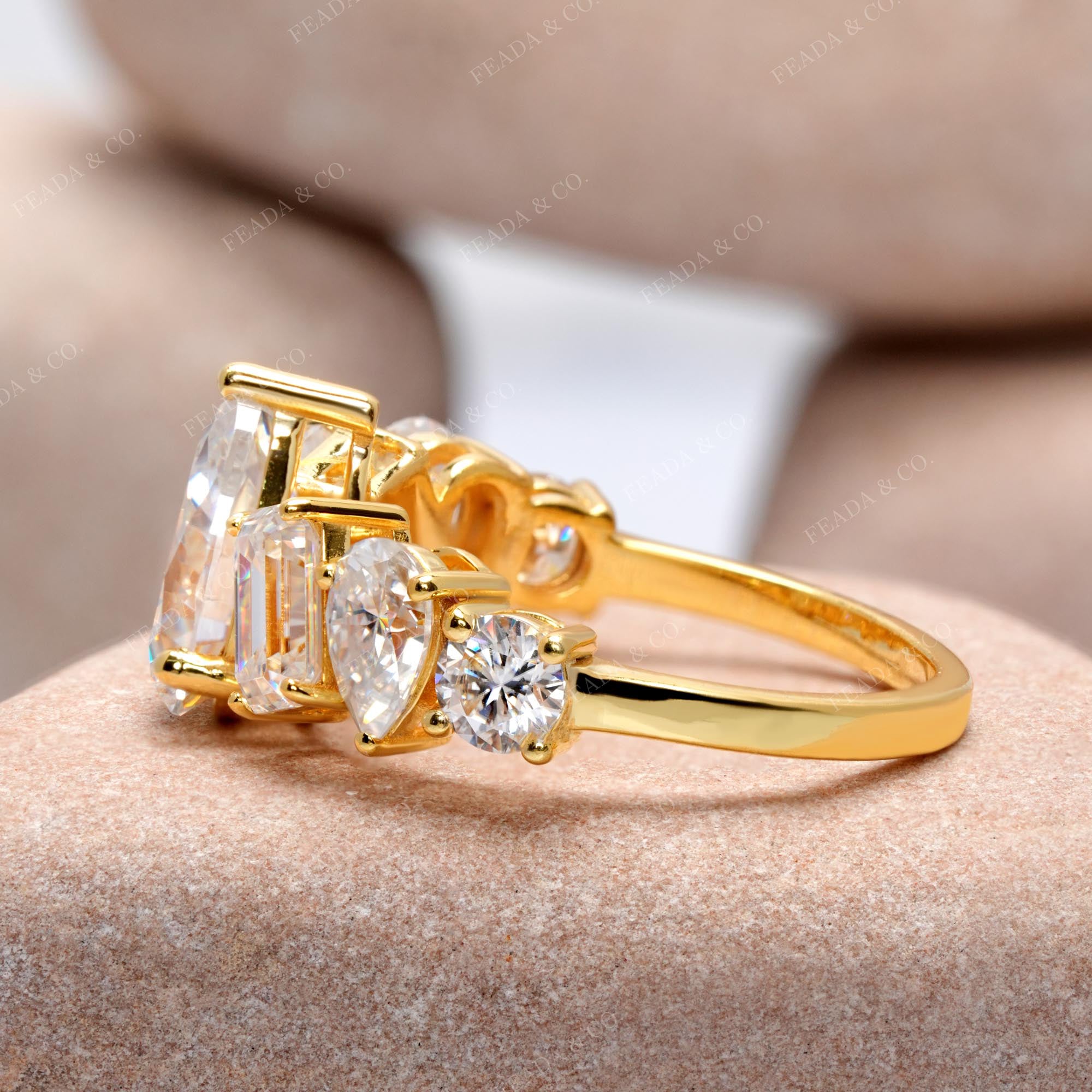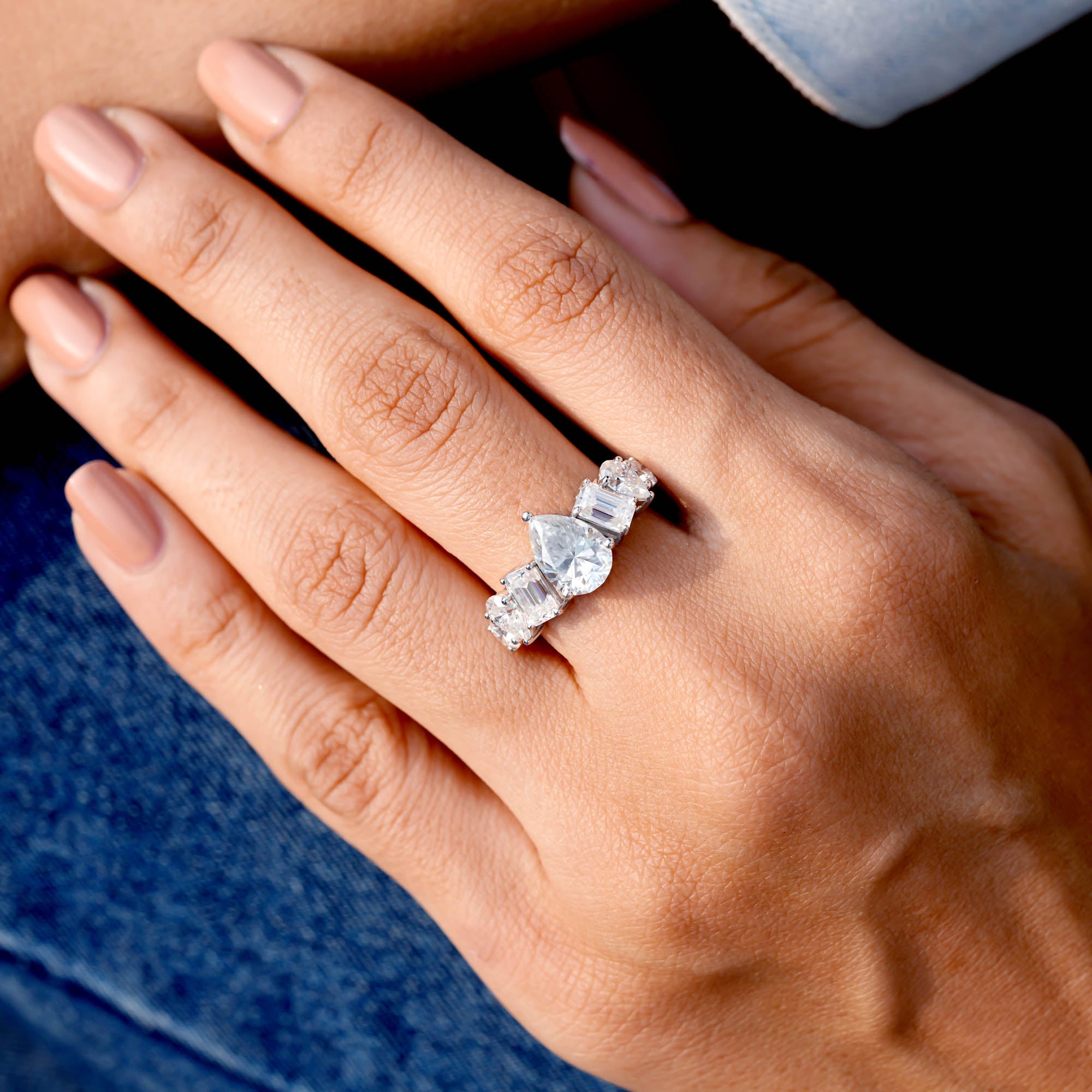 This stunning engagement ring boasts a total carat weight of 4.3, featuring a round, emerald, and pear cut stones that are colorless, allowing for maximum brilliance and sparkle. Hand-crafted with precision, this ring is the perfect symbol of true love and commitment.